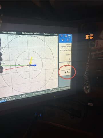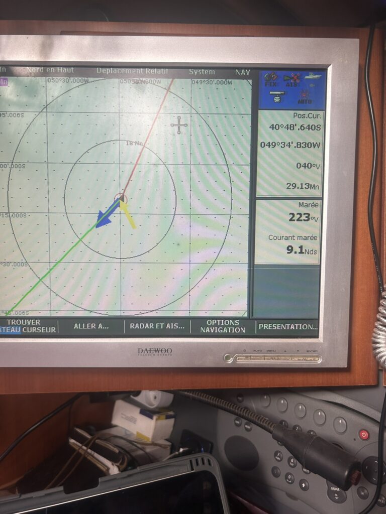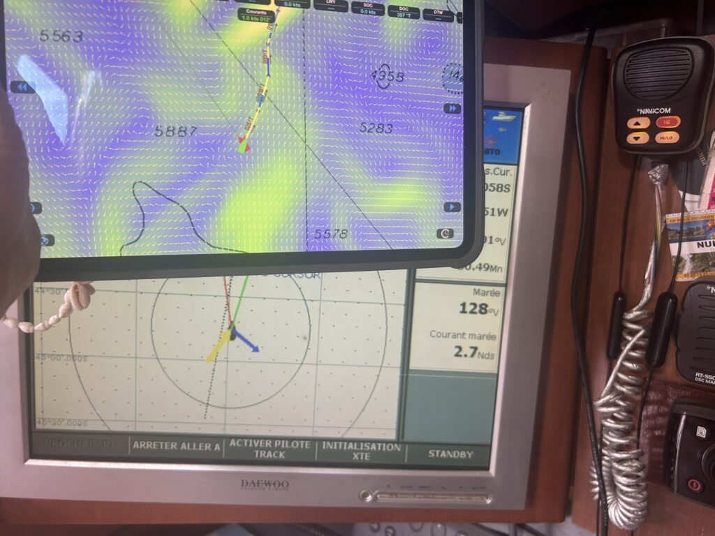 10 Heures, avec ce courant de 5 nœuds. Malgré le fait que l’on ait poussé Ohana au max, ce qui n’est pas dans nos habitudes, on avançait à 8 nœuds surface et 3 nœuds SOG (donc réel), ça ne fait pas beaucoup. La progression vers l’ouest se fait de plus en plus difficile, car le vent à augmenté jusqu’à force 7, dans une mer de plus en plus pourrie. Le reste de la progression s’est fait avec un courant moyen de 3 nœuds de face.