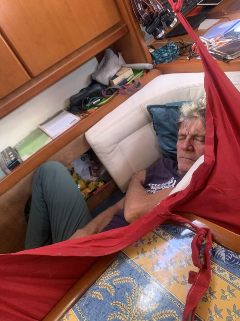 La météo étant plutôt tranquille, nous décidons de monter Ludo dans le mât, pour rattacher correctement le déflecteur radar, qui s’est un peu détaché du mât pendant le dernier coup de vent et qui ne cesse de taper dans les haubans. La mer étant toujours autant agitée, nous mettons Ohana à la CAPE. Le fait de mettre le bateau à la CAPE, penche un peu le mat, mais surtout amorti fortement les mouvements de roulis du bateau. Décidemment çà devient une habitude de monter au mât en pleine mer. Pour cette fois çà va être rapide. Ludo monte avec 2 risselants et Marie le hisse au niveau de la seconde barre de flèche. A peine arrivée, les deux colliers sont posés et hop Marie redescend Ludo, et l’affaire est dans le sac ! Youpi, opération réussie. D’aucun diront que ce n’étais pas utile de monter car le réflecteur n’aurait pas abimé les haubans. Mais nous avons choisi d’enlever le bruit qui était très désagréable dans le carré et on ne voulait qu’il camoufle un autre bruit, plus vital pour le mât.